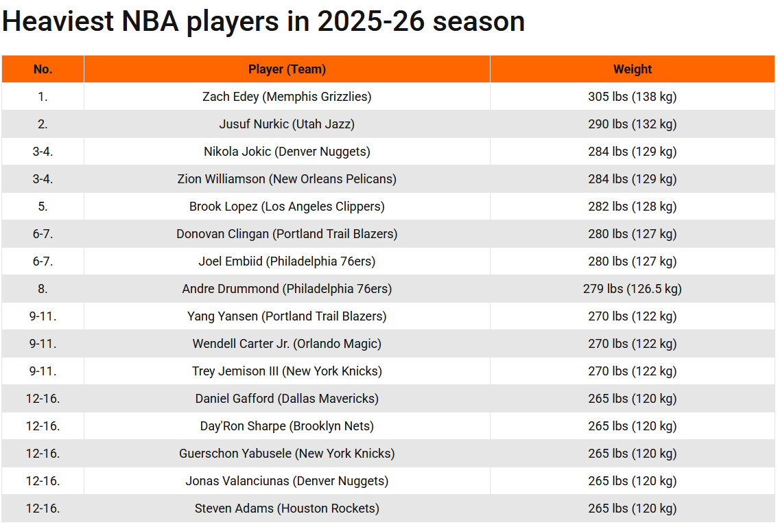 Cầu thủ Zach Eady của Grizzlies đã gia nhập NBA vào năm ngoái. Anh đã chiếm vị trí đầu tiên trong danh sách cân nặng của NBA kể từ mùa giải trước. Anh sẽ tiếp tục giữ ngôi đầu ở mùa giải mới, tiếp theo là Nurkic của Jazz. Điều bất ngờ là Zion of the Pelicans đã giảm cân rất nhiều trong mùa hè này nhưng vẫn xếp thứ 3 với Jokic.